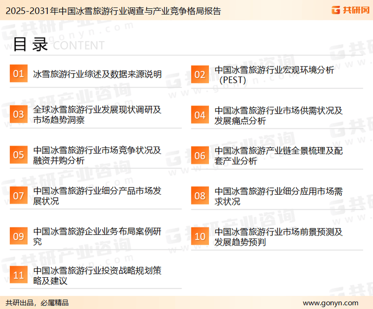 共研产业研究院通过对公开信息分析、业内资深人士和相关企业高管的深度访谈,以及分析师专业性判断和评价撰写了《2025-2031年中国冰雪旅业调查与产业竞争格局报告》。本报告为冰雪旅游企业决策人及投资者提供了重要参考依据。